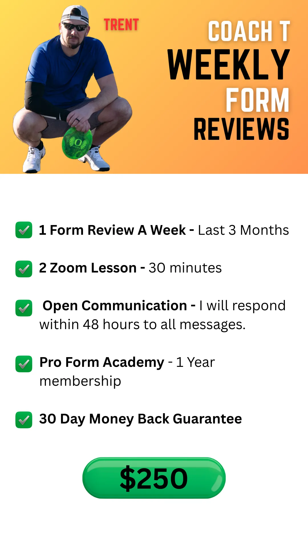 People are social creatures, and when you have a large group reminding each other to stay disciplined every single day, your likelihood of success dramatically increases. Anyone can watch a free YouTube video on disc golf instruction, and MAYBE it will help. But when you have daily reminders asking for your form progress, specific drills to perform each week, and seeing others success, then you have the environment for success.